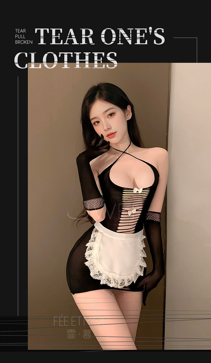 嬌俏女僕.火辣條紋露胸可撕網衣女樸套裝-黑【連身網衣+圍裙+手套*2】