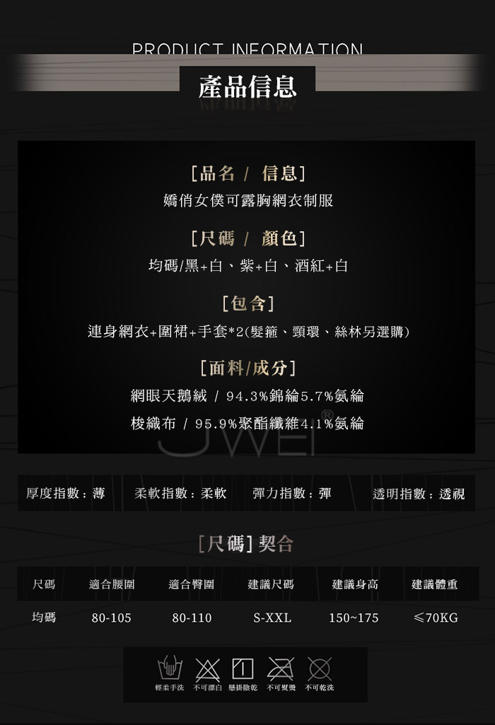 2.基於保障消費者個人衛生,情趣衣物類恕不接受退換貨,如為商品本身暇疵,接受三日內換貨,請勿試穿。