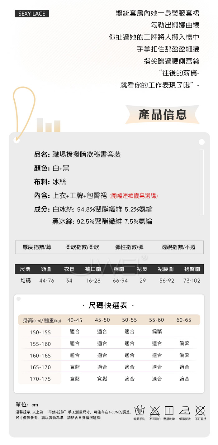 ►您現在的位置:首頁>職場佳麗.撩撥暗慾腰腹雙邊蕾絲秘書套裝【上衣+工牌+包臀裙】