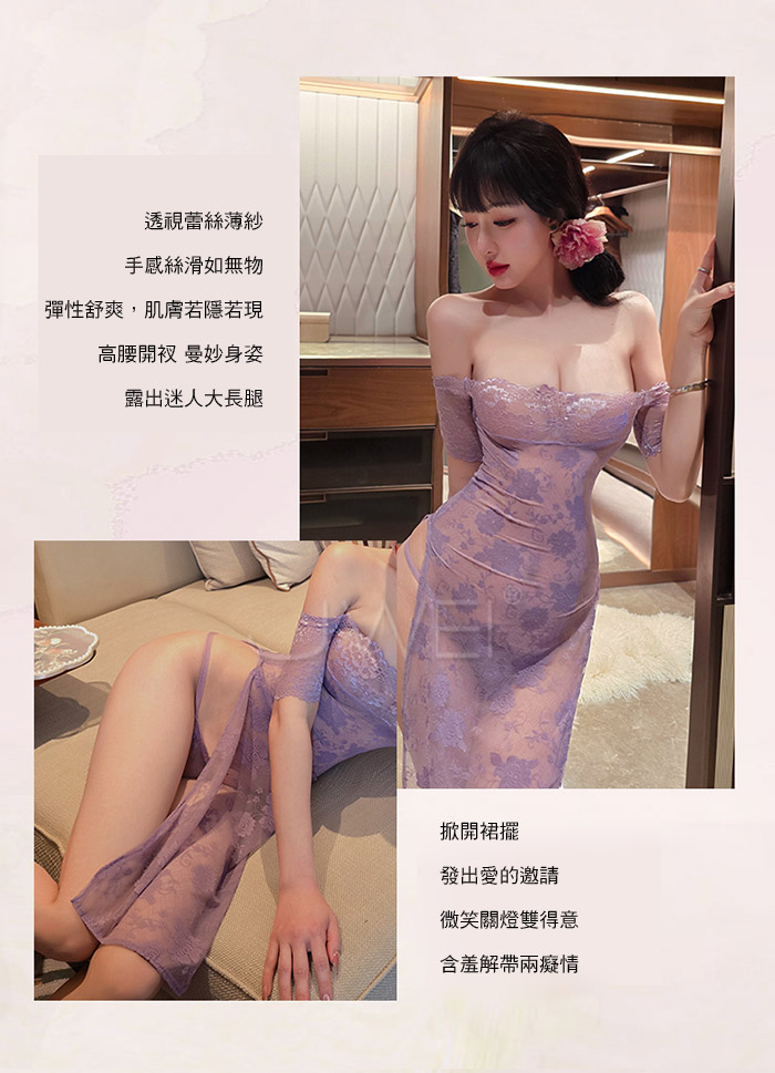 漫野玫瑰.純欲一字肩蕾絲柔美鏤空開衩連身睡衣 【連衣裙+T褲】