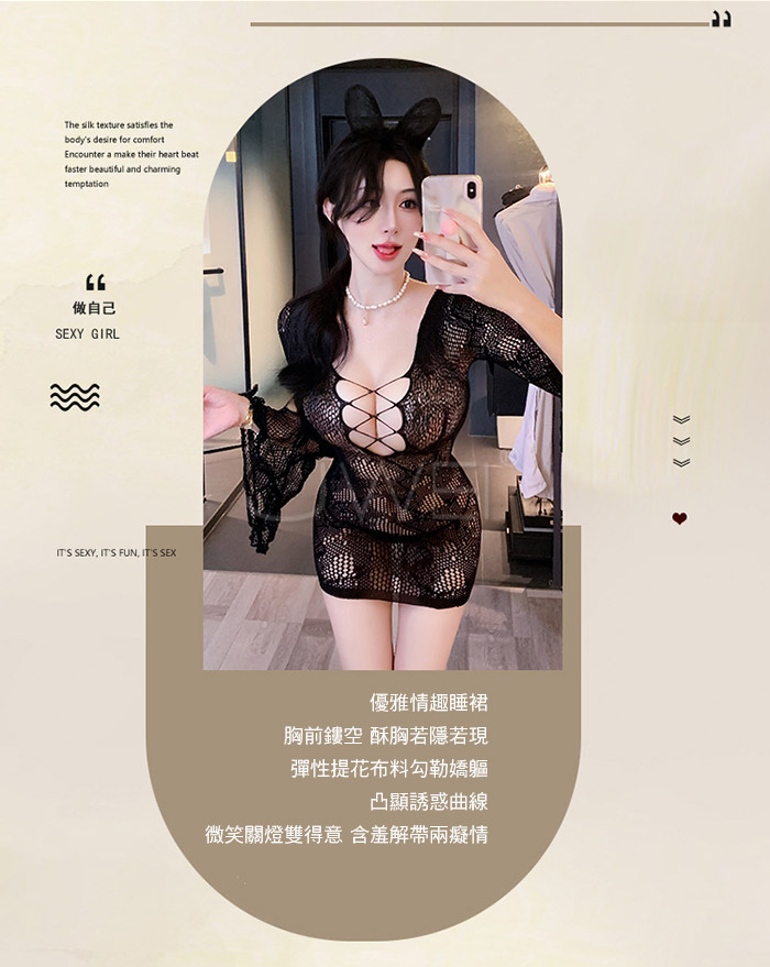 ►您現在的位置:首頁>沐雅春風.鏤空美胸輕盈優雅喇叭袖口包臀網衣