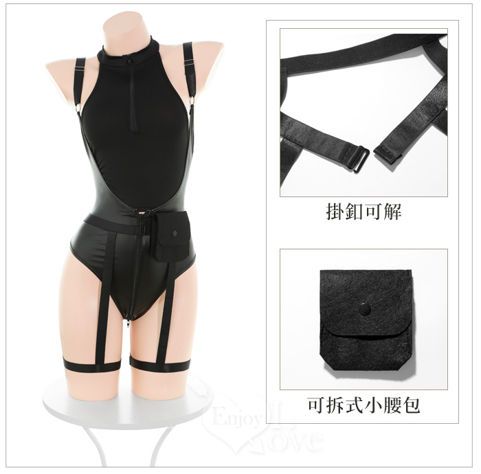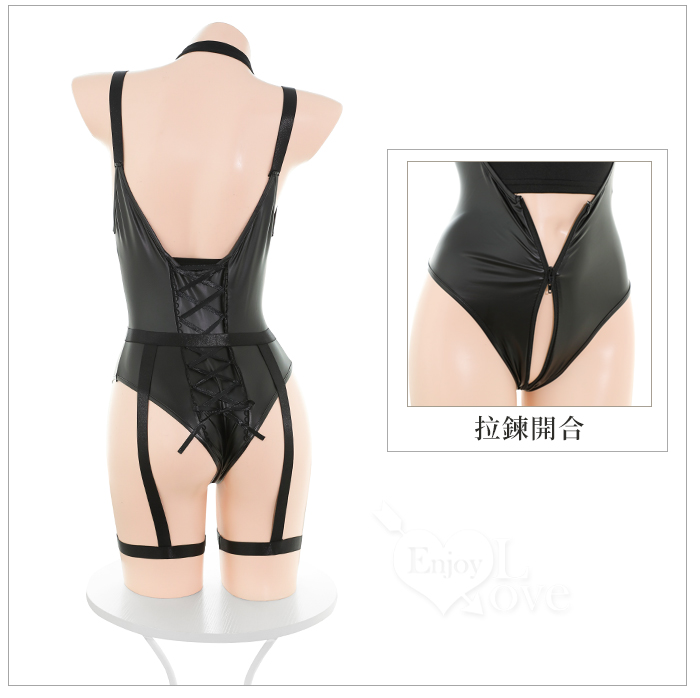 酷感削肩漆皮連身衣|拉鍊開合設計+可拆腰帶腿環四件式套裝