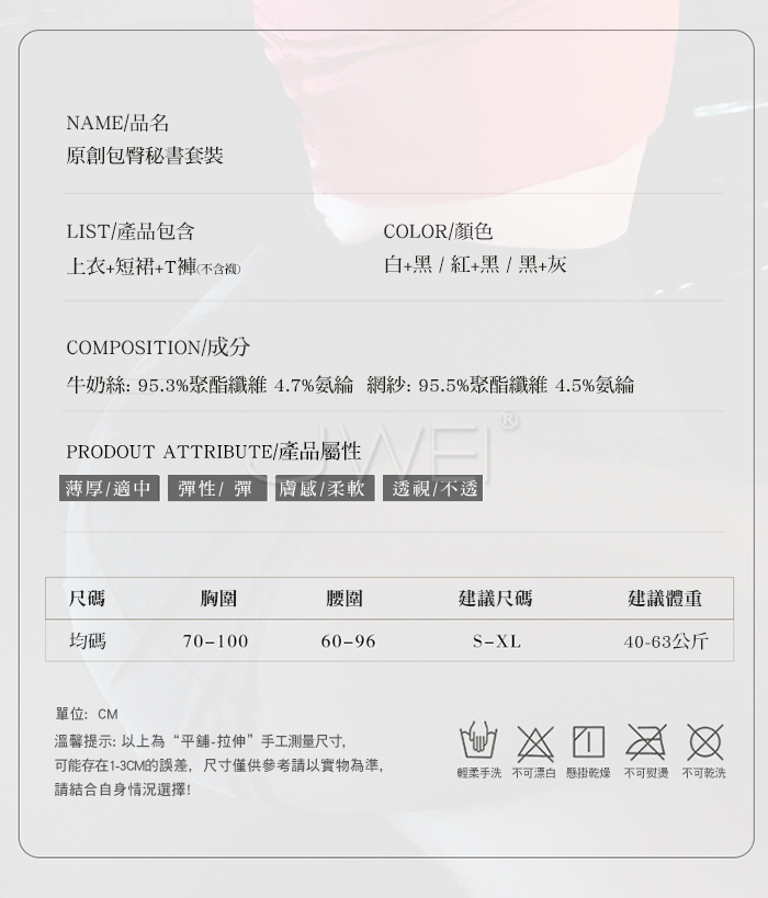 ■內容物:上衣+短裙+T褲 ■適穿尺寸:FREESIZE ■彈性:彈 ■未撐開平量尺寸正負誤差1~2cm,1吋=2.54cm ■注意事項:基於保障消費者個人衛生,此貼身衣物恕不接受退換貨。 (如為商品本身暇疵,接受七日內換貨,請勿試穿,謝謝您)
