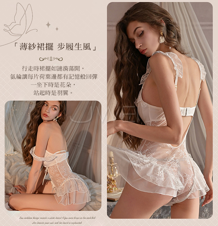 ►您現在的位置:首頁>慾情薔薇.蕾絲深V美肩露背花蔓透紗開襠連體衣【白色】