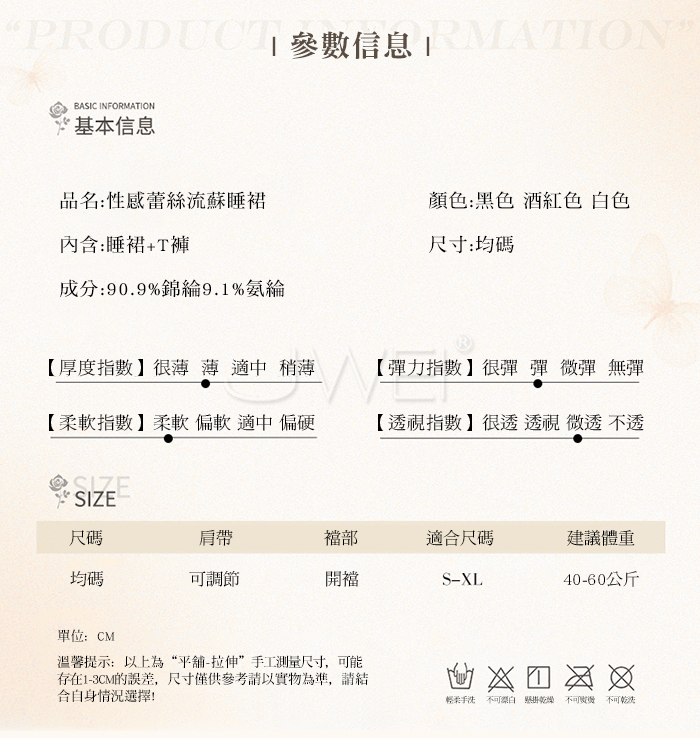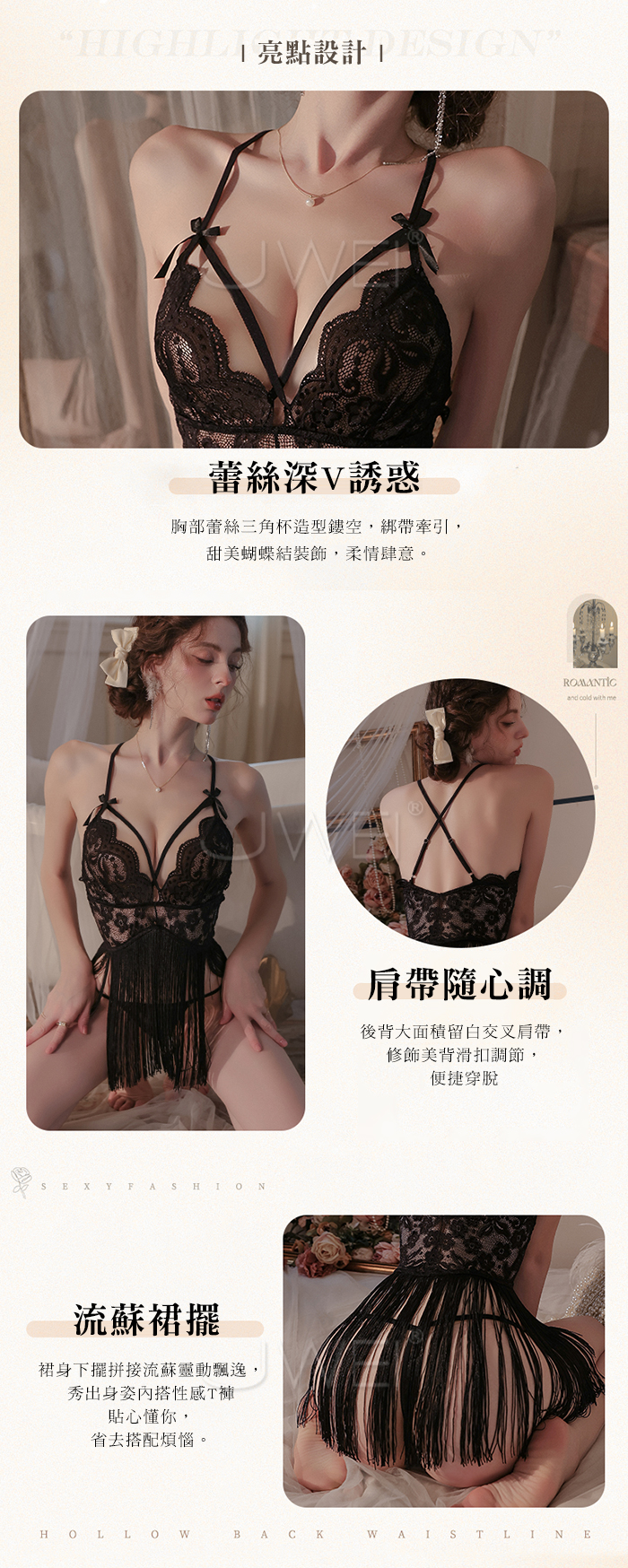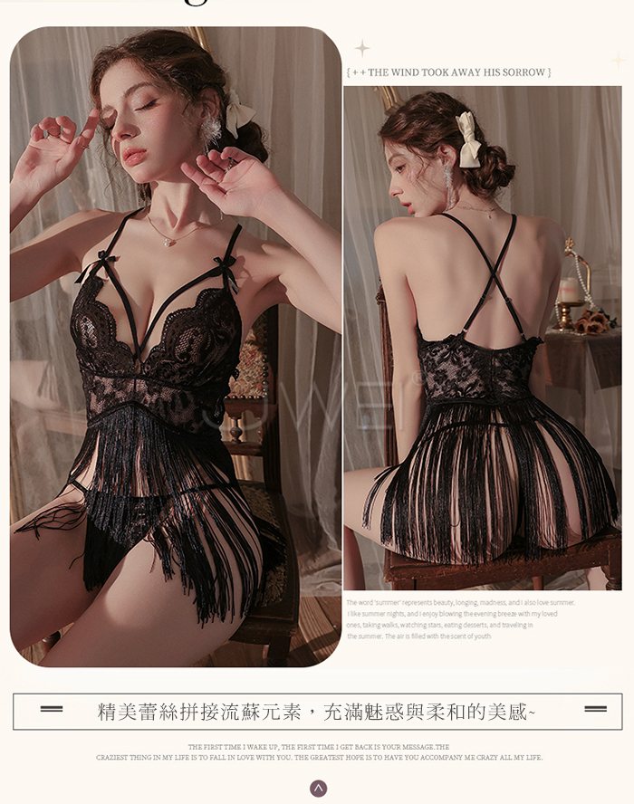 首頁>輕舞搖曳.網眼蕾絲深V誘惑流蘇裙襬露臀睡裙【睡裙+T褲】黑色