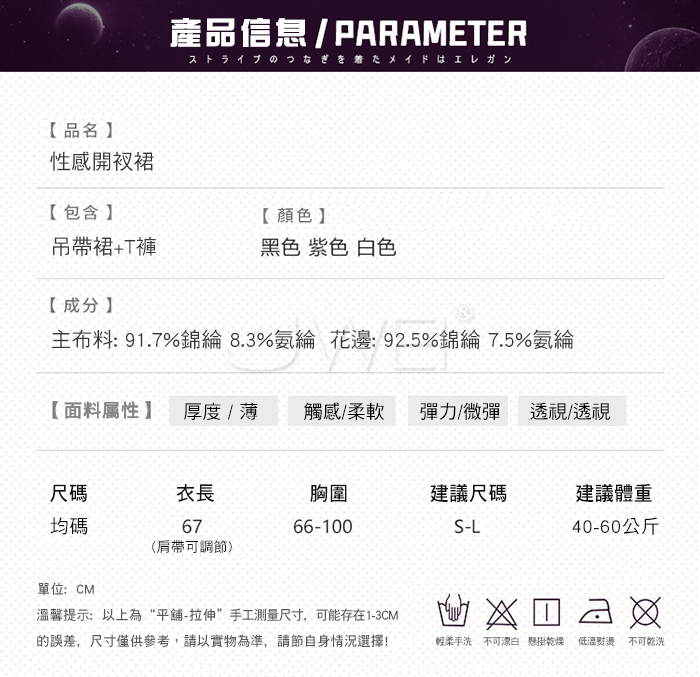 ■內容物:吊帶裙+T褲 ■適穿尺寸:FREESIZE ■彈性:微彈 ■未撐開平量尺寸正負誤差1~2cm,1吋=2.54cm ■注意事項:基於保障消費者個人衛生,此貼身衣物恕不接受退換貨。 (如為商品本身暇疵,接受七日內換貨,請勿試穿,謝謝您)