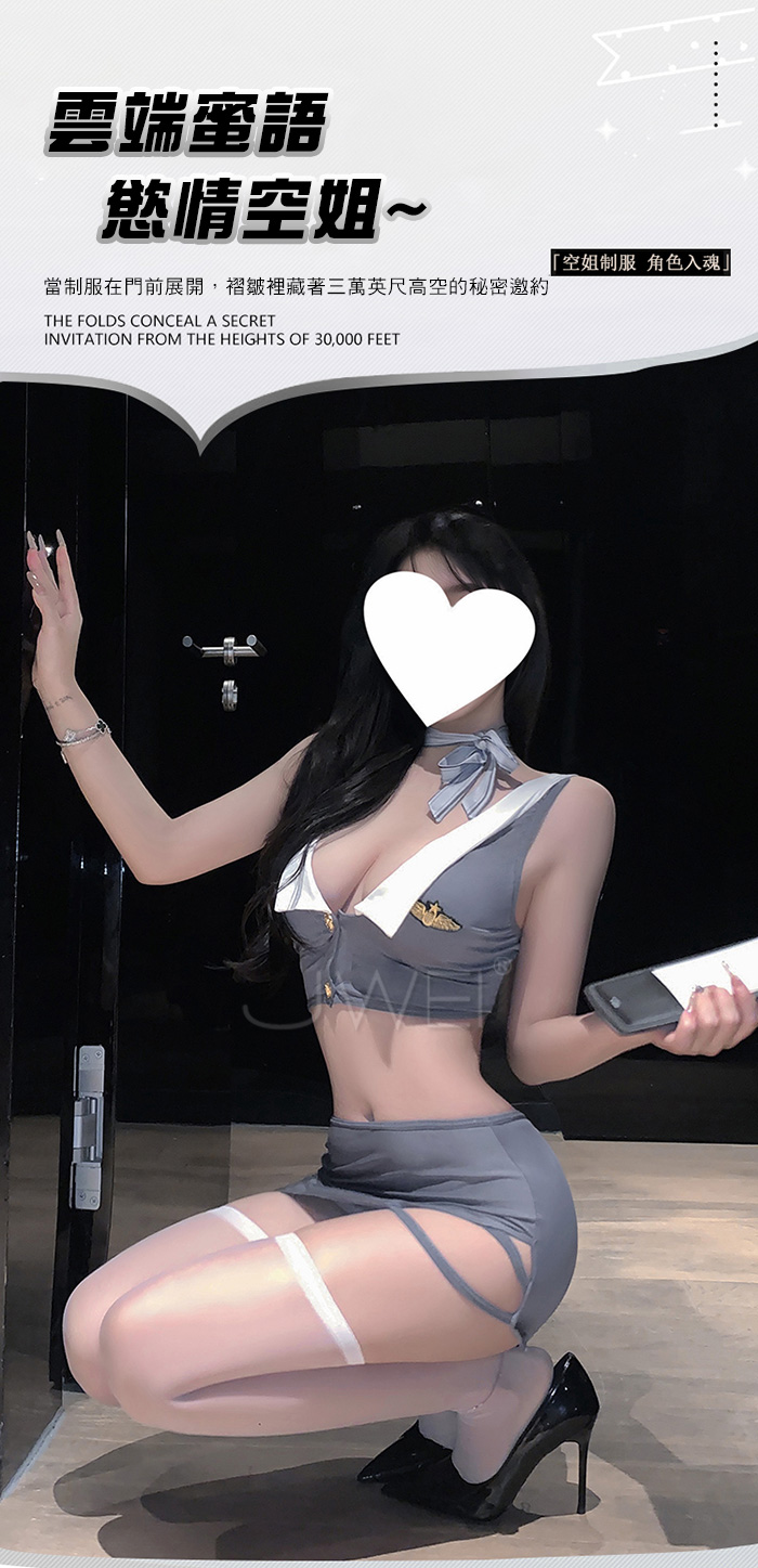 | 雲端蜜語.深V露溝裙襬鏤空包臀慾情空姐套裝【上衣+短裙+絲巾+T褲】