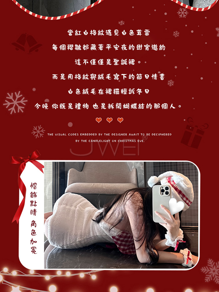 ►您現在的位置:首頁>夢夜覆雪.紅白格紋平口裹胸白色毛絨修身包臀連身裙套裝【帽子+連身裙+手環】